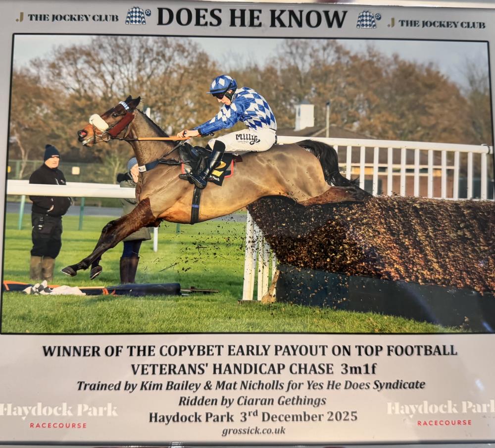 Haydock was where Does He Know strutted his stuff, and it was brilliant to see him genuinely enjoying himself again. His last win came in the Grimthorpe Chase at Doncaster some 18 months ago under David Bass. David’s style and Ciaran’s couldn’t be more different, but the end result was the same: Ciaran steered him round for a very easy success.