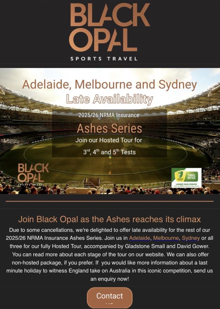 I love it. Roger Hart, who has never been known to miss an opportunity, was straight on the email yesterday morning to let me know that the travel agency, Black Opal, due to late availability now have tickets for tickets to the Adelaide, Melbourne and Sydney Tests.
