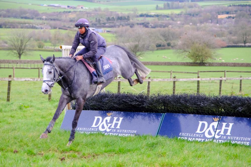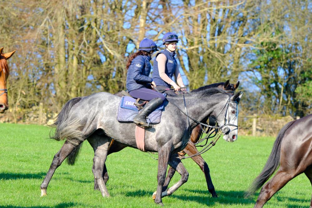 We thought we’d make the most of it and get a smart photograph of White Noise in our yard sponsor’s colours..Dodson & Horrell, but, as ever, horses have a habit of rewriting the script. You wouldn’t believe it, she was so fresh she simply refused to stand still. Every time we thought we had her, she had other ideas. In the end, we admitted defeat and called it a bad job. One for another day.
