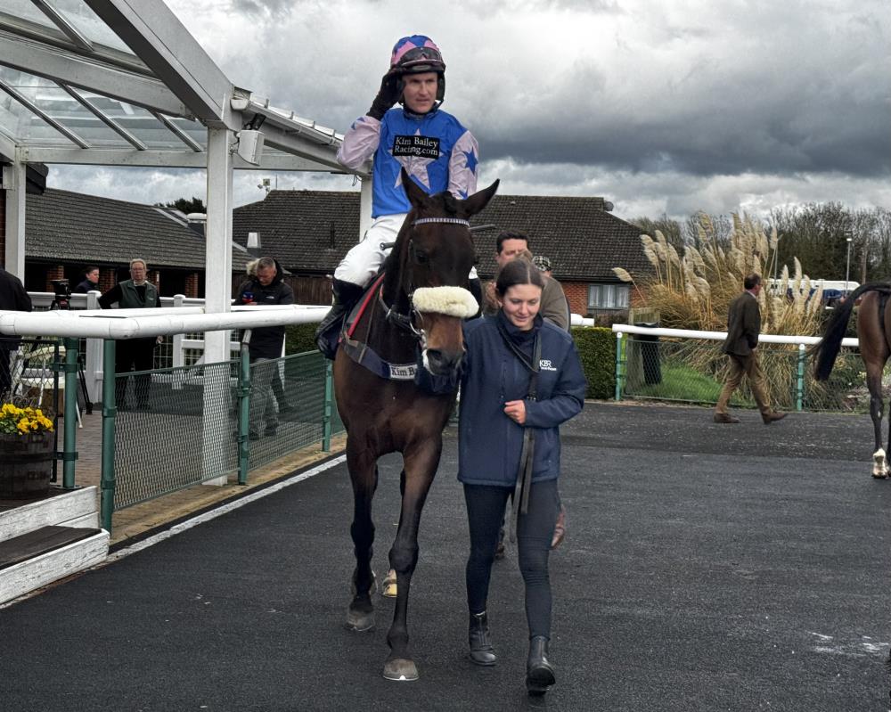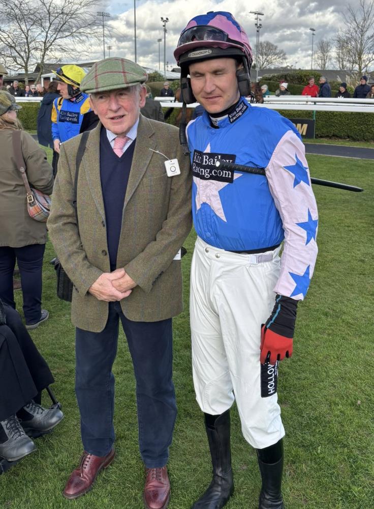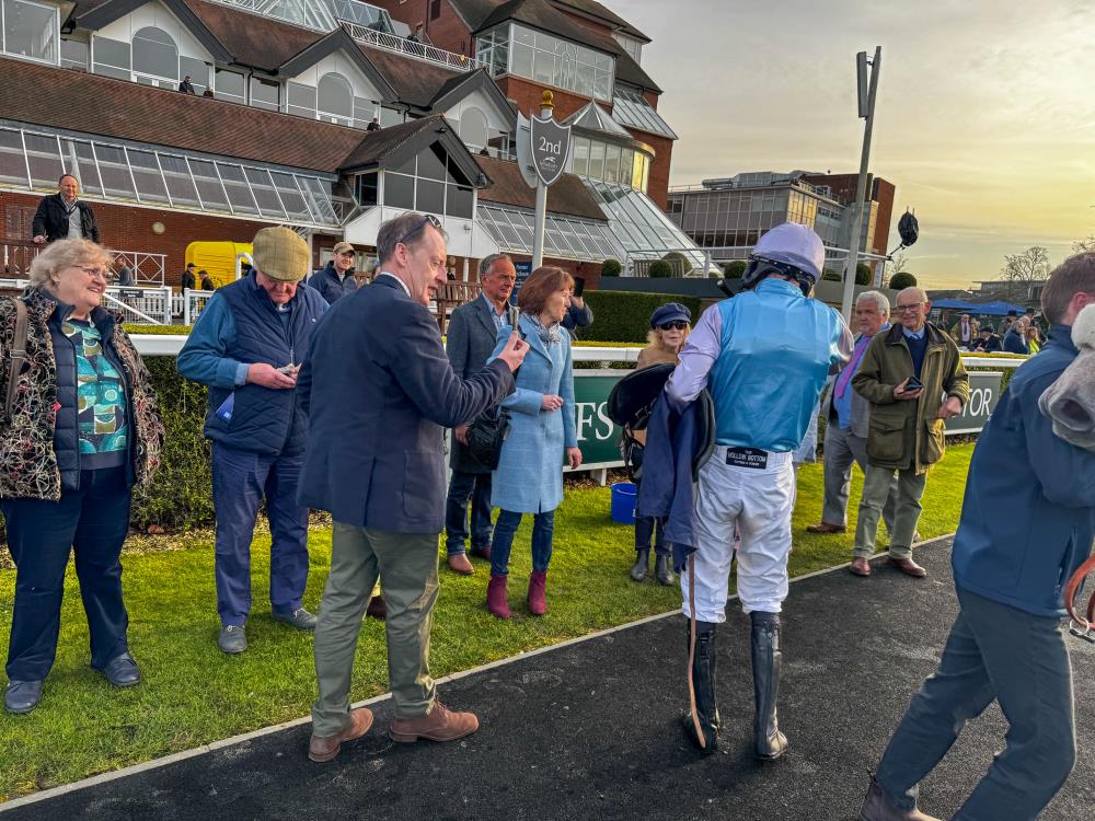 Thankfully, we had a winner to make the trip worthwhile. Hillberry Hill made a very impressive debut for us in the novice hurdle, in truth, he never came off the bridle. He’d had a couple of runs in Ireland winning one and was bought through the Thoroughbid online sale by John Perriss and Ed Bailey.. Thoroughbid were understandably delighted and their representative Cornelius Lysaght was on hand to video winning owner and trainer..